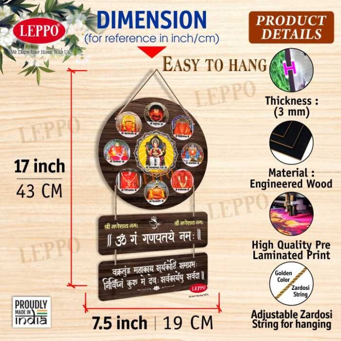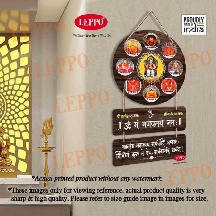 LEPPO crafted Lord Ganesha Wall Hanging featuring the Ashtavinayak Ganpati Darshan and powerful Sanskrit mantras. This is perfect wall decor for your home temple, living room, or entrance also makes for an auspicious gift during festivals, housewarming parties, or for loved ones seeking peace and prosperity.