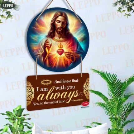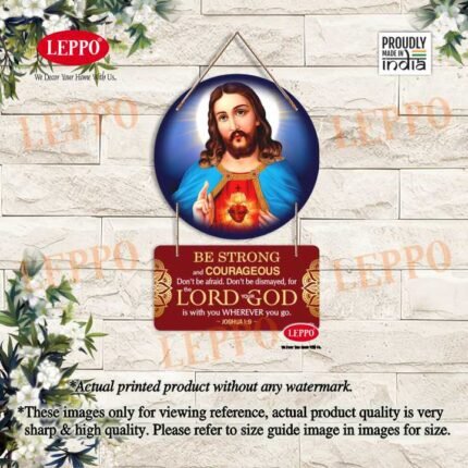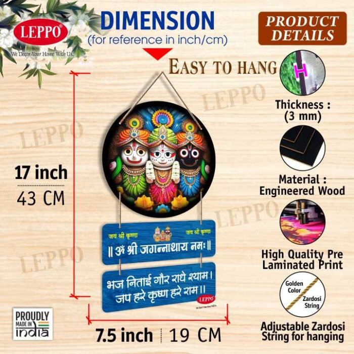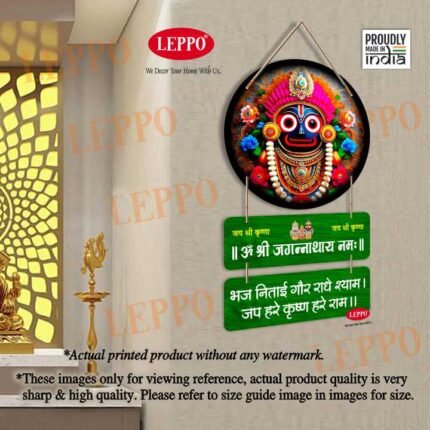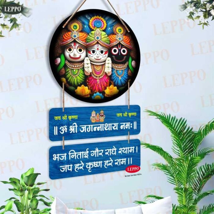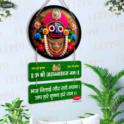 LEPPO Wooden Wall Hanging of Lord Jagannath with Om Shri Jagannathay Namah mantra, crafted from high-quality MDF wood, it showcases vibrant colors, devotional quotes, and a traditional design that enriches any prayer space.