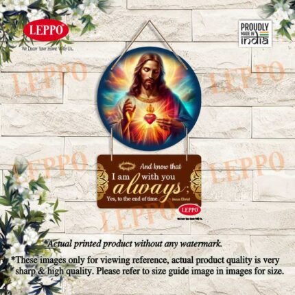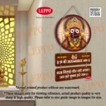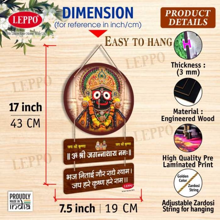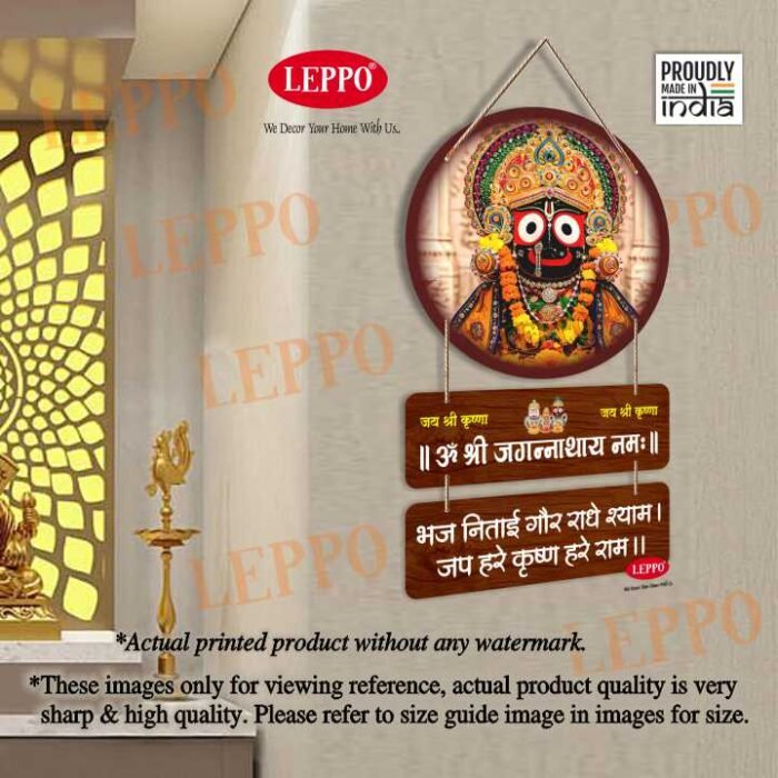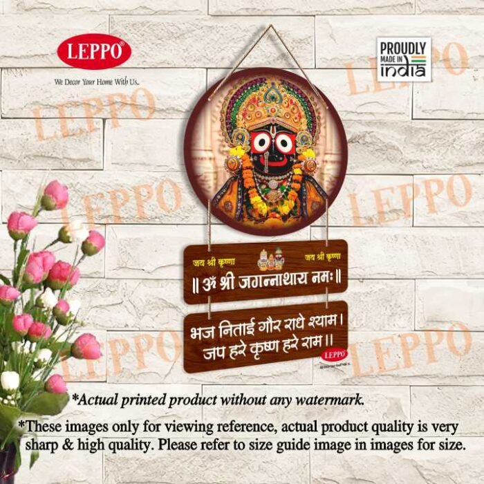 LEPPO Wooden Wall Hanging of Lord Jagannath with Om Shri Jagannathay Namah mantra, crafted from high-quality MDF wood, it showcases vibrant colors, devotional quotes, and a traditional design that enriches any prayer space.