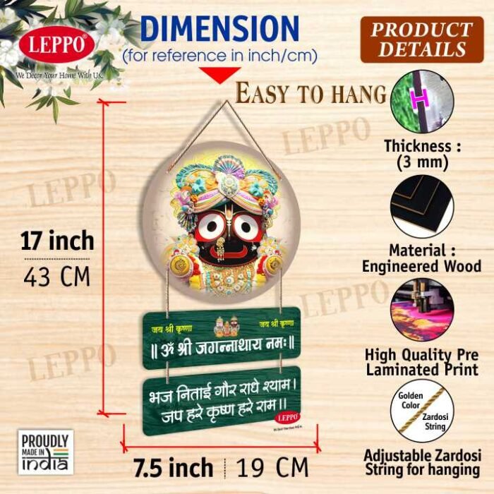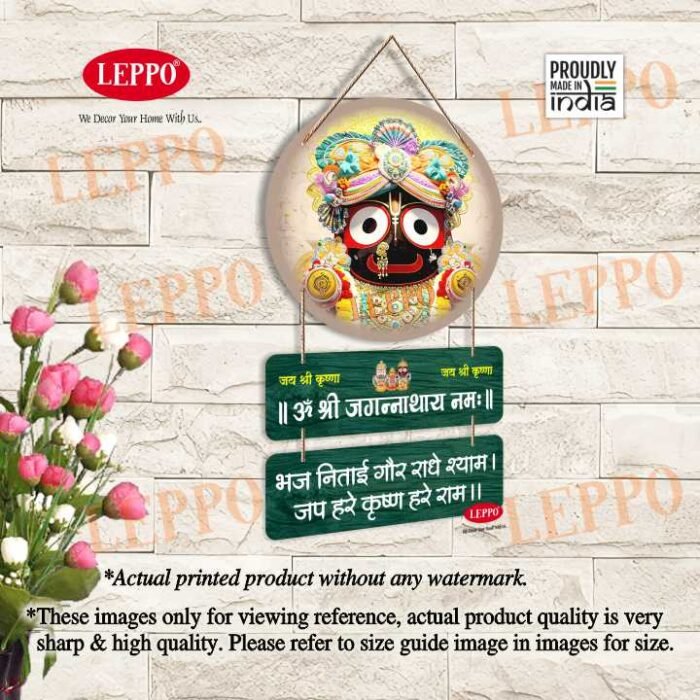 LEPPO Wooden Wall Hanging of Lord Jagannath with Om Shri Jagannathay Namah mantra, crafted from high-quality MDF wood, it showcases vibrant colors, devotional quotes, and a traditional design that enriches any prayer space.