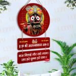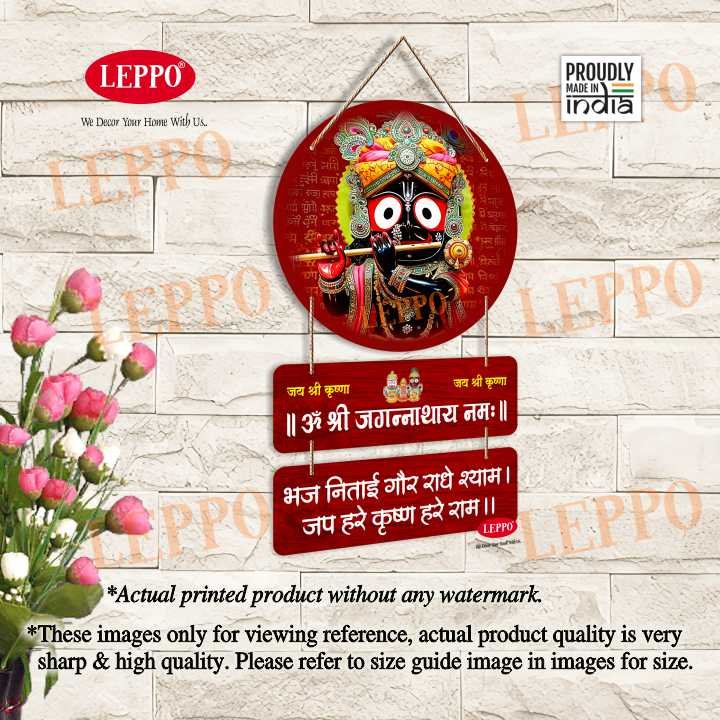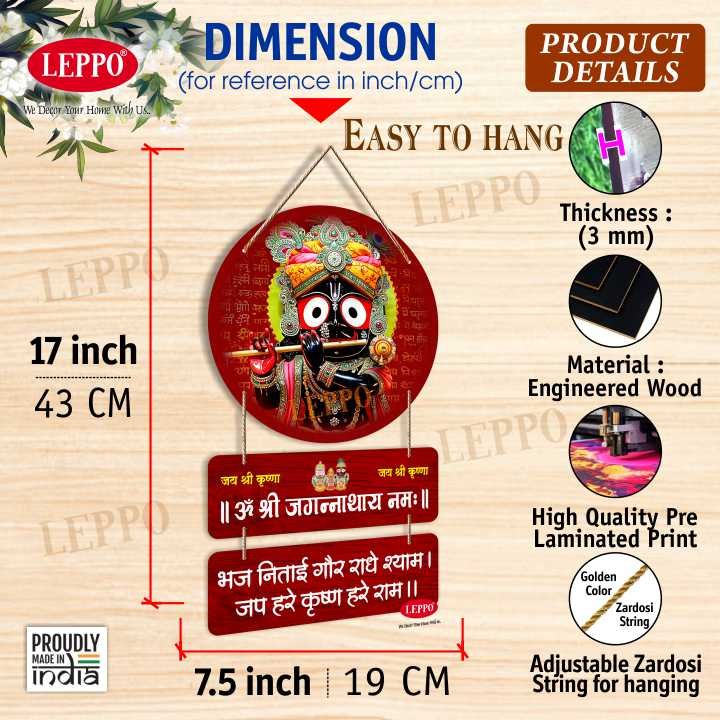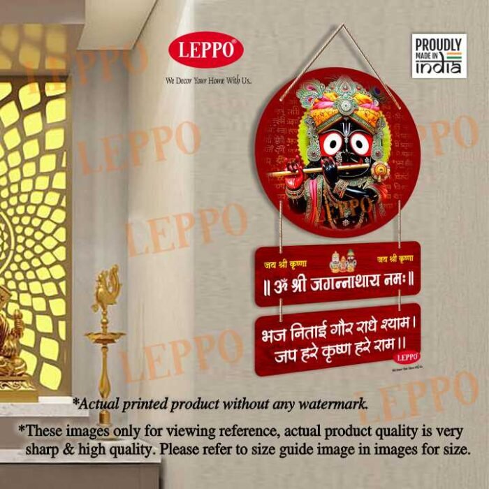 LEPPO Wooden Wall Hanging of Lord Jagannath with Om Shri Jagannathay Namah mantra, crafted from high-quality MDF wood, it showcases vibrant colors, devotional quotes, and a traditional design that enriches any prayer space.