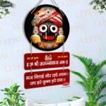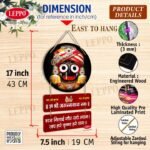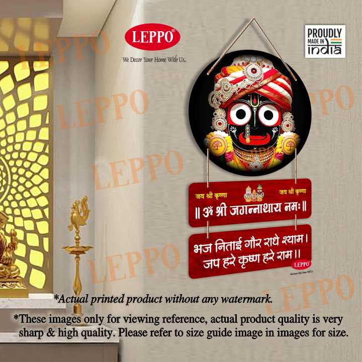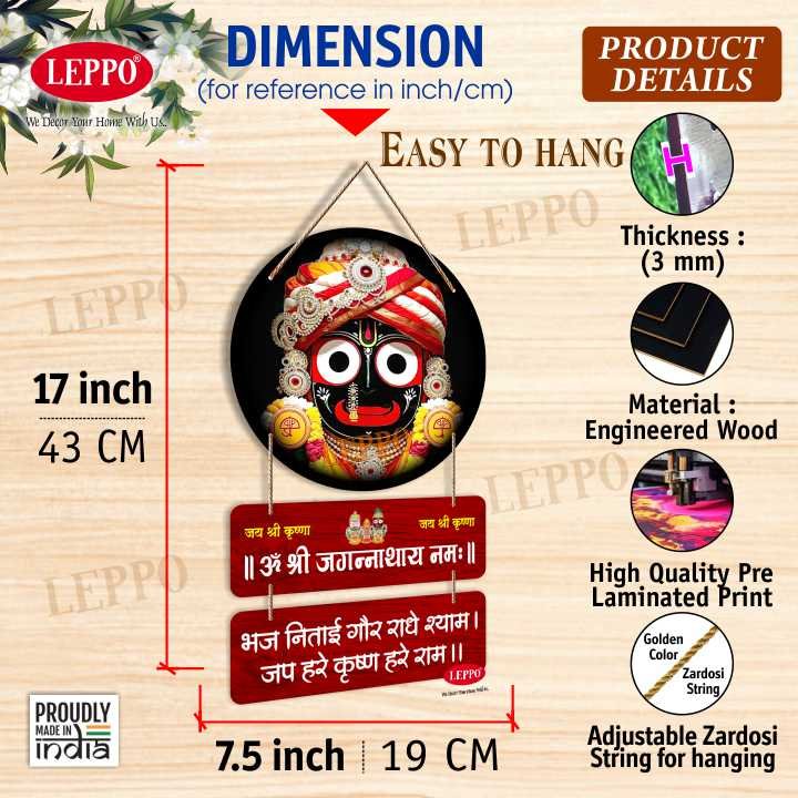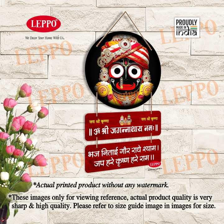 LEPPO Wooden Wall Hanging of Lord Jagannath with Om Shri Jagannathay Namah mantra, crafted from high-quality MDF wood, it showcases vibrant colors, devotional quotes, and a traditional design that enriches any prayer space.