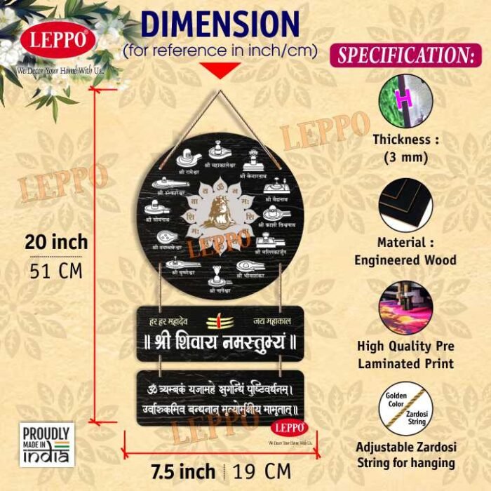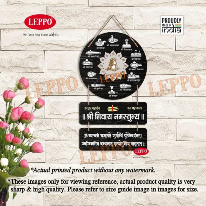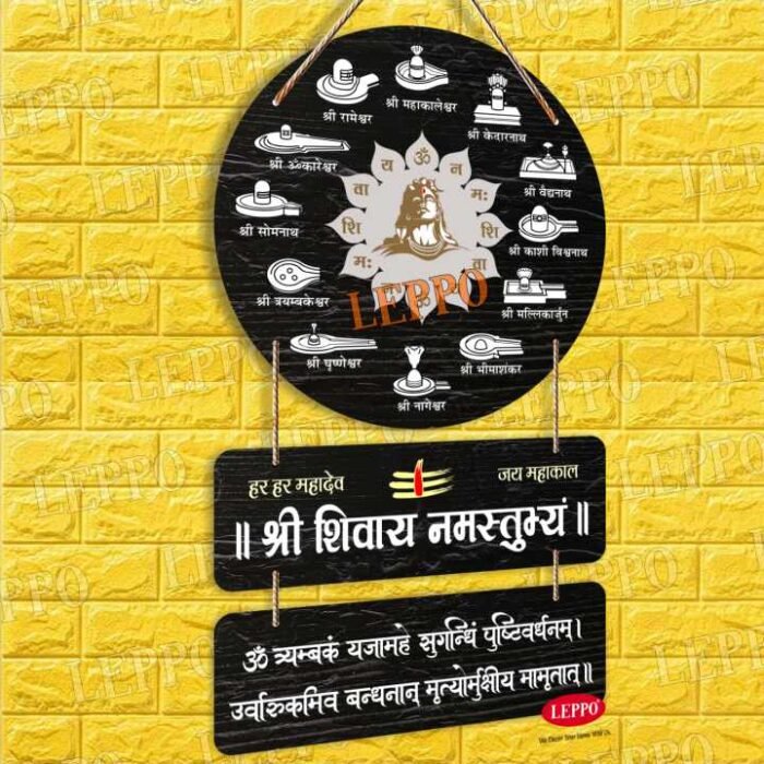 LEPPO Wooden Wall Hanging bring divine blessings into your home with this beautifully crafted Lord Shiva Wall Hanging. Featuring the 12 sacred Jyotirlingas, the powerful “Shri Shivaya Namastubhyam” chant, and the Maha Mrityunjaya Mantra, this spiritual decor piece creates a peaceful and devotional atmosphere in any space.