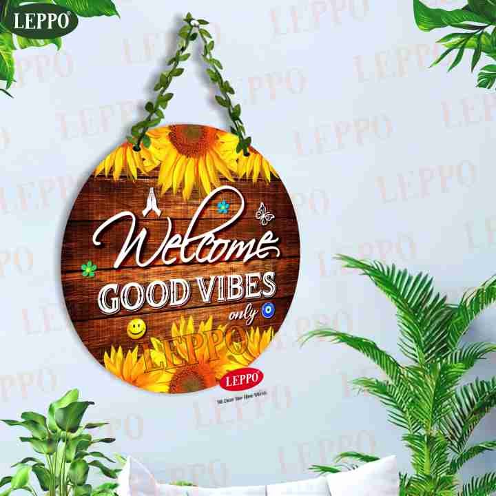 “LEPPO” Bring warmth, positivity, and elegance to your home entrance with this beautiful “Welcome Good Vibes Only” Decorative Hanging Board. Designed with a premium floral pattern on a round base, this signboard adds a stylish touch to your main door, living room, hallway, balcony, office entrance, or shop. The artificial leaf chain gives it a natural, green look that enhances any wall decor.