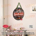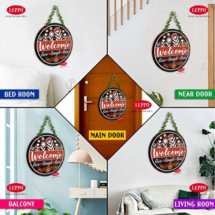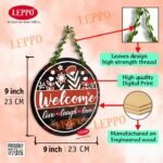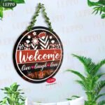 LEPPO “Welcome Live, Laugh & Love” Wooden Wall Hanging Board. Crafted with elegant floral design and a natural wood finish, this sign adds a welcoming touch to your entrance, balcony, or living space. The artificial leaf chain gives it a natural, green look that enhances any wall decor.